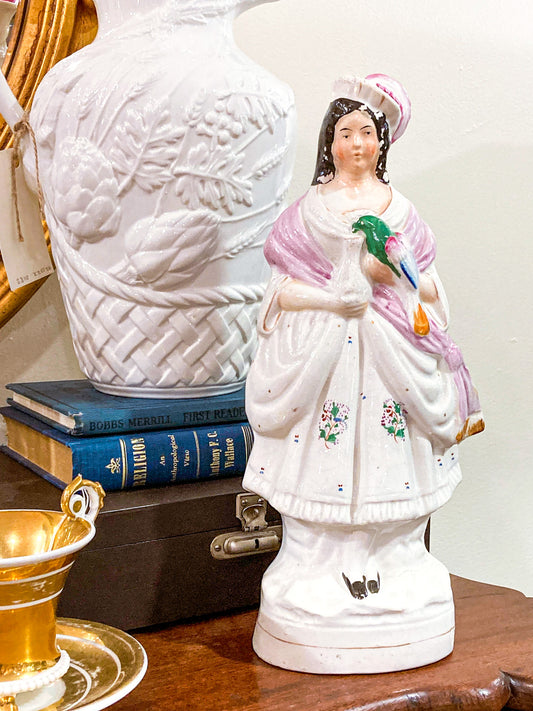 Antique 19th Century Staffordshire Lady Holding Parrot Porcelain Figure Sculpture
