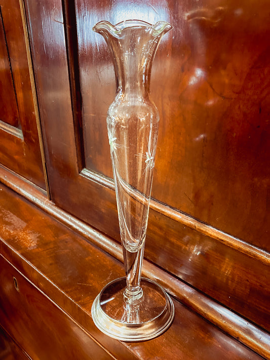 Vintage Clear Glass Ruffled Rim Starburst Etched Wallace Sterling Silver Bud Vase