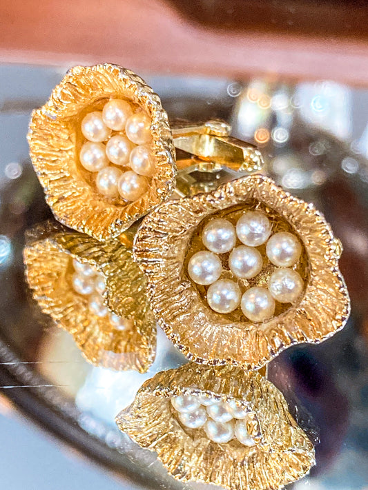 Vintage Gold Pearl Lotus Seed Bird Nest Egg Cufflink Pair Accessory