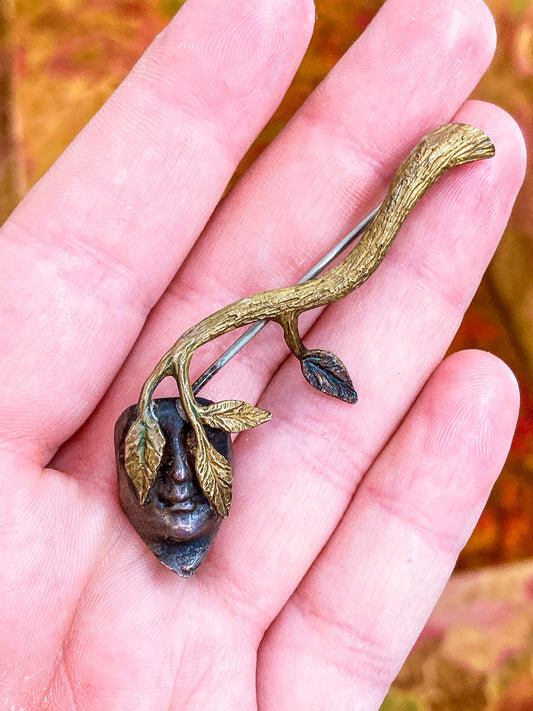 Vintage Linda Hesh Sculptural Branch Leaf Mask Face Brooch Pin