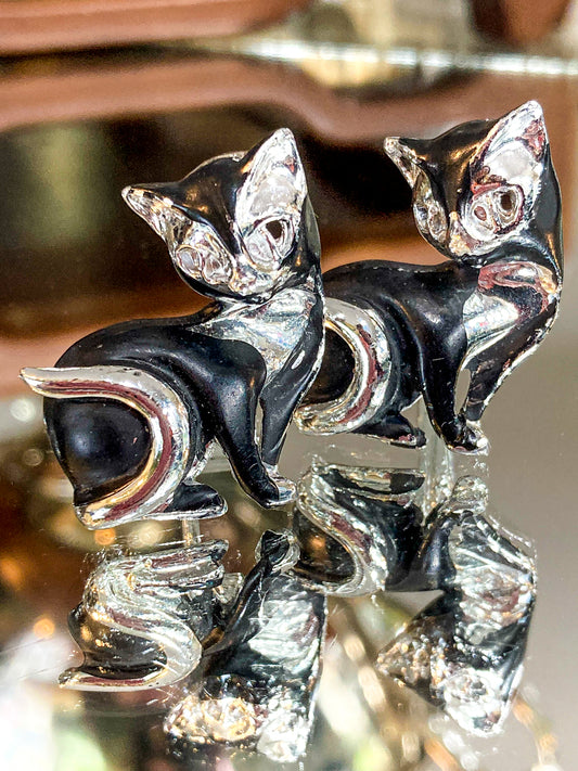 Vintage MCM Kitsch Silver Chrome Enameled Black Cat Cufflink Pair