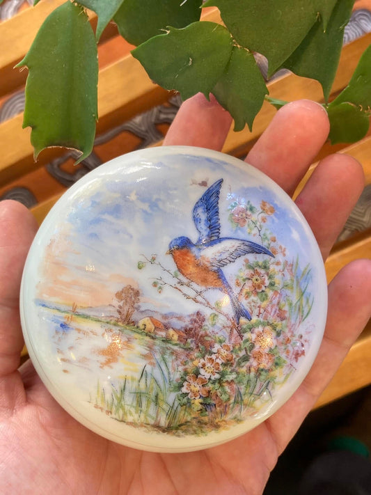 Antique Limoges France Blue Bird Scenic Round Lidded Porcelain Trinket Pillbox
