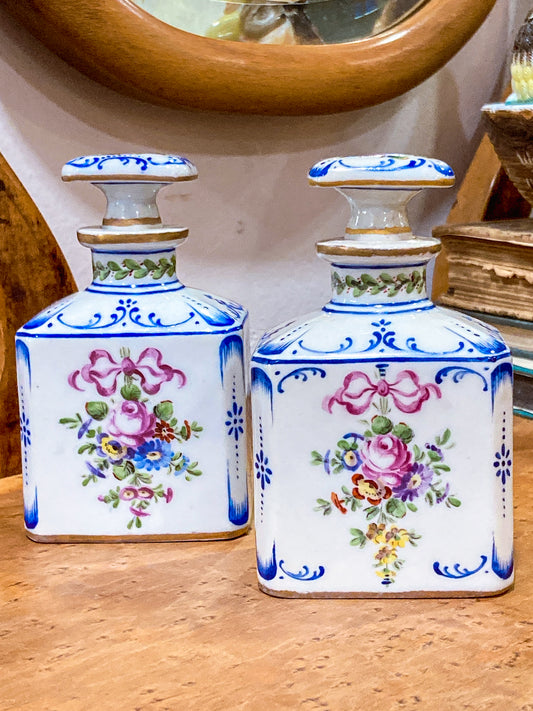 Antique Pair Hand Painted Floral French Porcelain Scent Fragrance Bottles