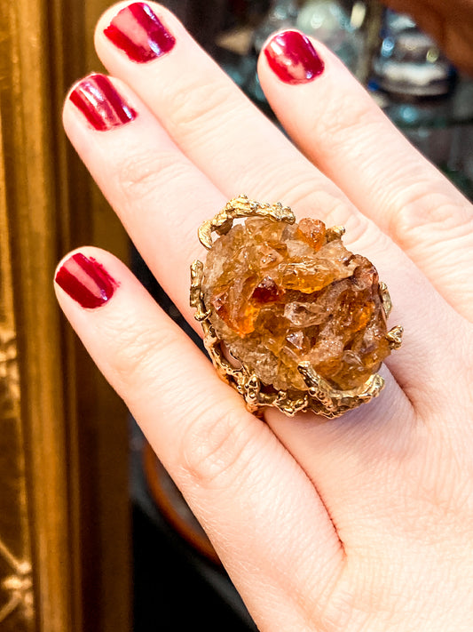 Vintage Artistic 14K Yellow Gold Brutalist Druzy Citrine Cocktail Ring