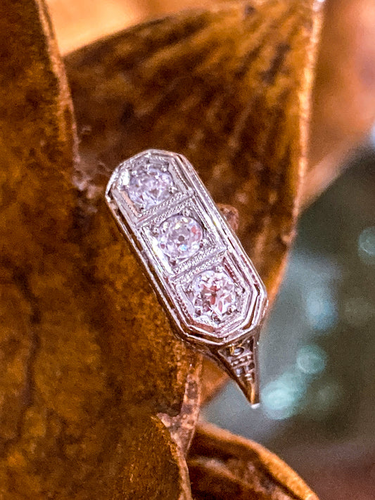 Vintage Art Deco 10K White Gold Filigree Triple Diamond Round Cut Ring