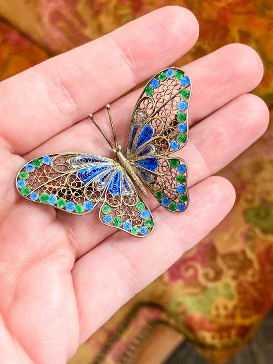 Vintage Enameled 800 Silver Blue Green Filigree Butterfly Brooch Pin
