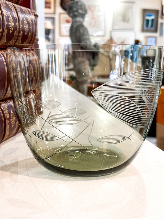 Vintage MCM Kaj Franck Finnish Fish Pattern Etched Green Gray Glass Bowl