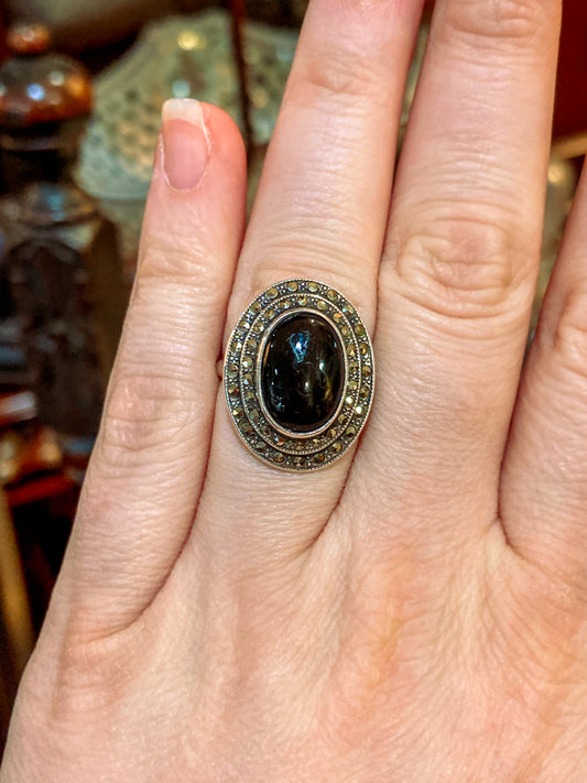 Vintage Sterling Silver Tiered Marcasite Black Oval Cabochon Ring