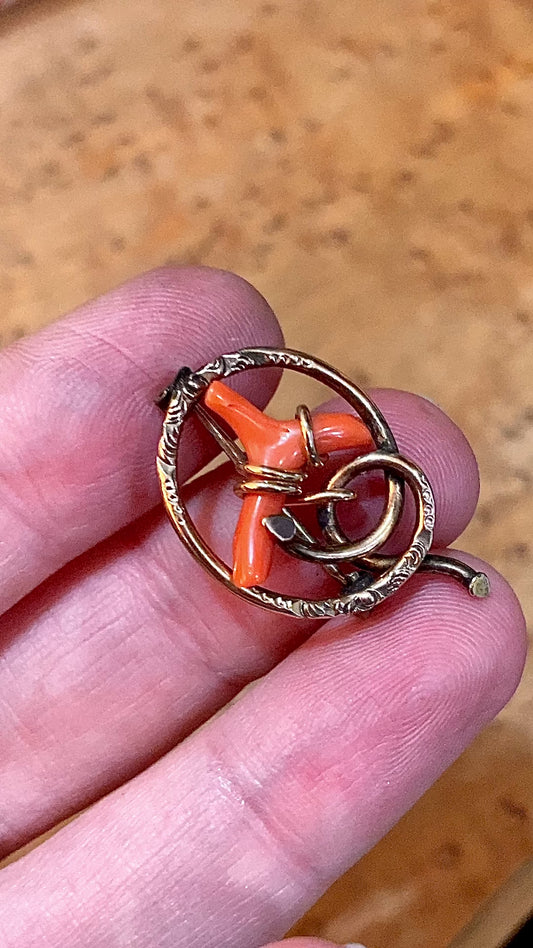 Antique Victorian Gold Filled Engraved Natural Coral Piece Love Knot Pin Brooch