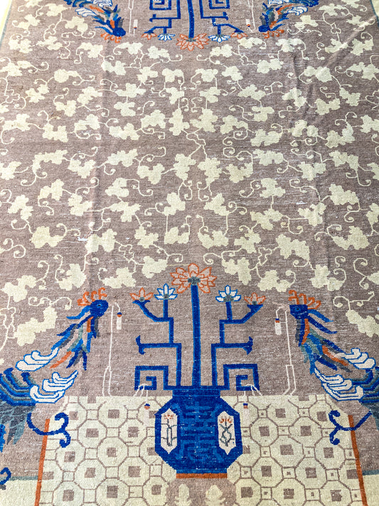 Antique 1910s Tan Blue Bird Art Deco Chinese 8x10ft Woven Wool Rug