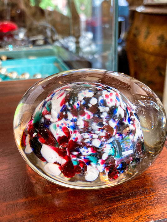 Vintage Multicolor Red White Blue Green Clear Bubble Glass Paperweight