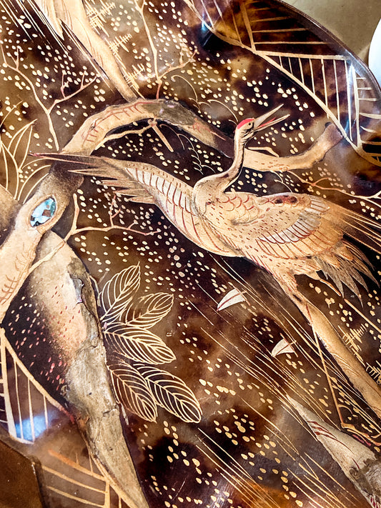 Antique Leaf Shape Gilt Crane Tortoise Shell Lacquer Dish Japanese Tray
