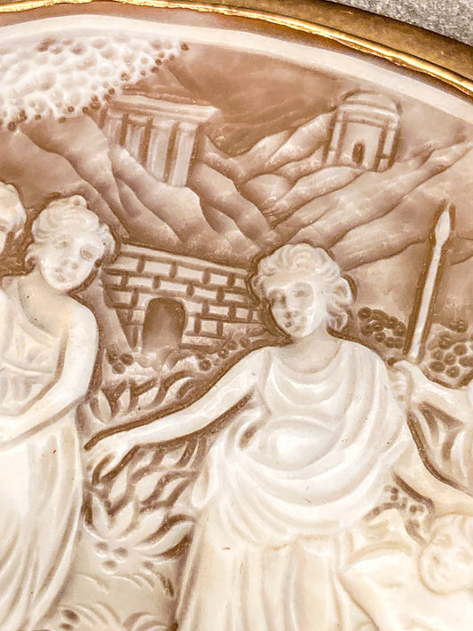 19th Century MAZZA 14K Yellow Gold Italian Shell Cameo Figural Scene Brooch