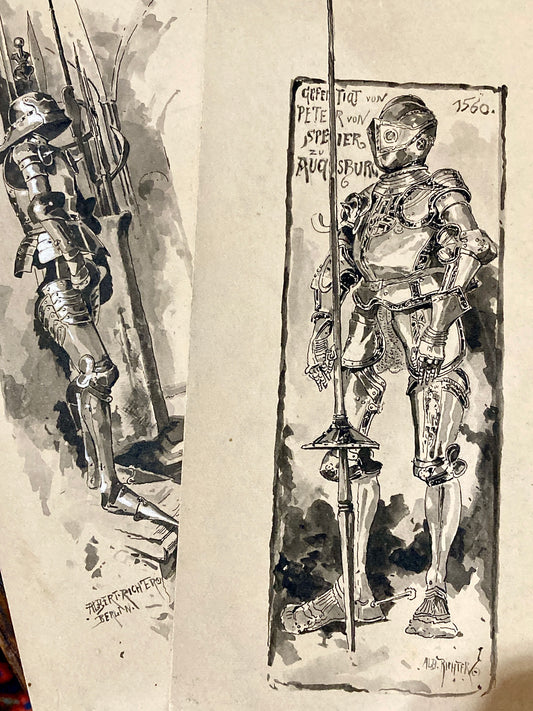 Pair Antique Albert Richter (1845 - 1898) Knight Armour Suit Fine Art Drawings