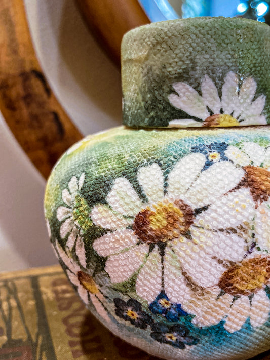 Vintage 1970 Daisy Painted Tapestry Porcelain Lidded Jar Art Pottery