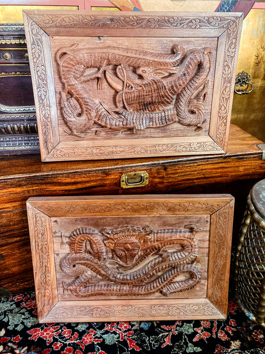 Pair of Intricately Hand Carved Relief Serpent Dragon Teak Wood Plaques