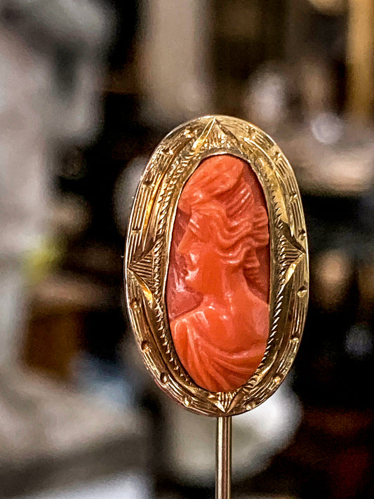 Antique 10K Yellow Gold Oval Hand Carved Coral Cameo Stick Pin