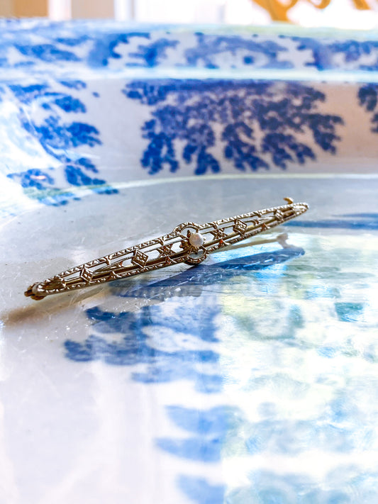 Antique Art Deco 10K Yellow Gold Seed Pearl Filigree Bar Pin Brooch