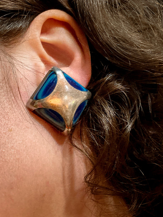 Vintage Mexico Sterling Silver Layered Blue Glass Geometric Clip On Earrings