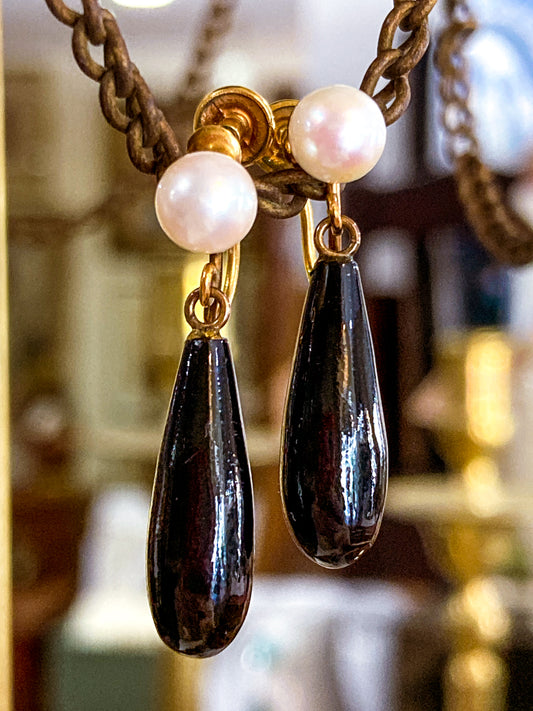Vintage 12K Gold Filled Pearl Black Tear Drop Dangle Screwback Earrings