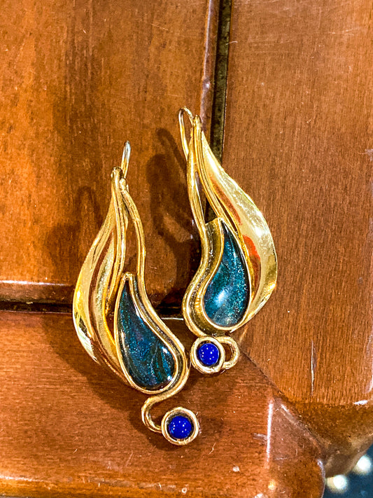 Vintage Abstract Gold Silver Tear Drop Green Blue Accent Drop Earrings