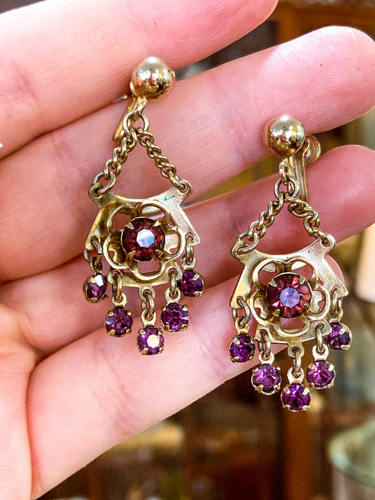Vintage Gold Tone Amethyst Rhinestone Screw Back Dangle Earrings