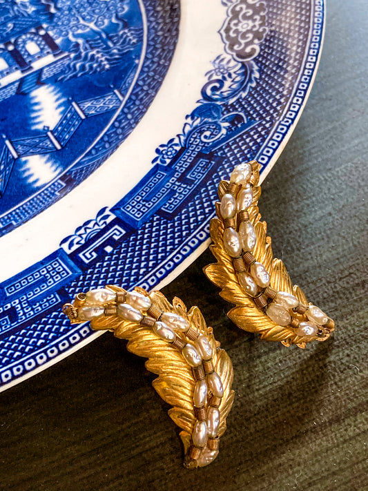 Vintage Miriam Haskell Gold Pearl Feather Ear Cuff Style Screwback Earrings