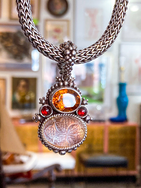 Vintage Stephen Dweck Sterling Silver 18K Gold Carved Quartz Pendant Necklace Signed