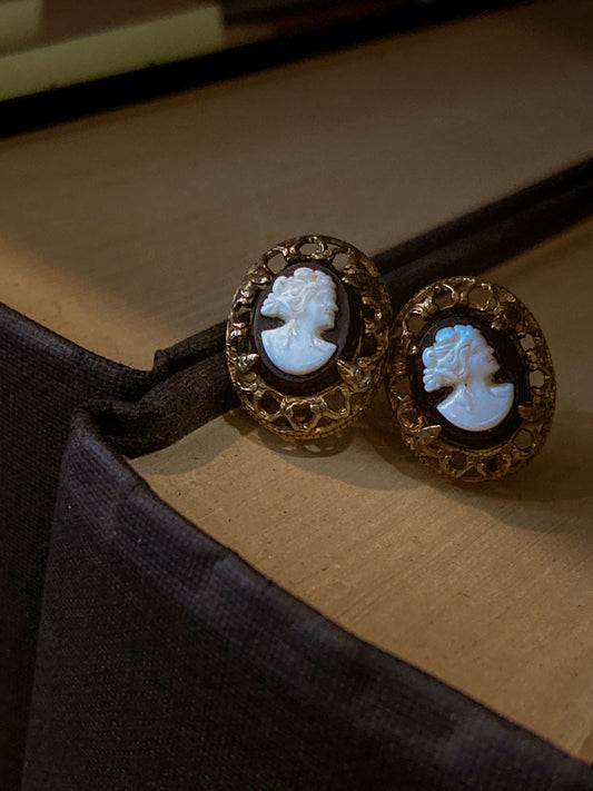 Vintage Black Cameo Filigree Gold-tone Sterling Silver Screwback Earrings