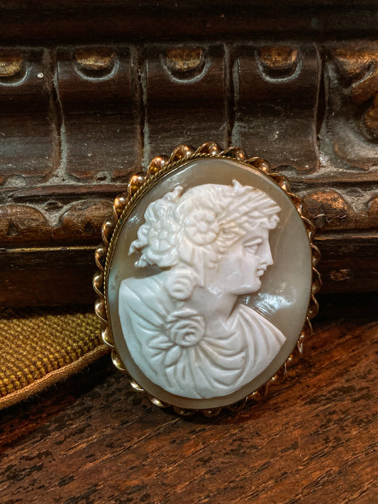 Vintage Twist Oval Gold Toned Italian Shell Carved Cameo Brooch Pin