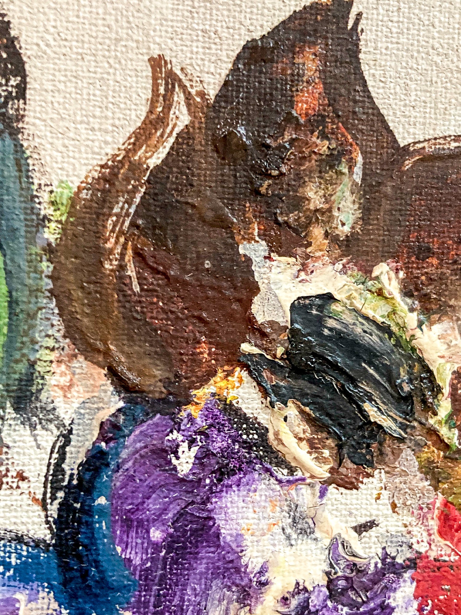 Take time to enjoy the flowers every day with this Midcentury Floral Still Life! A colorful bouquet of blossoms burst out of a teal vase. The vase sits on a blue table against a pink and beige wall. Framed in green and gold, the lively colors pop. Spring will always be near with this painting hanging in your home.