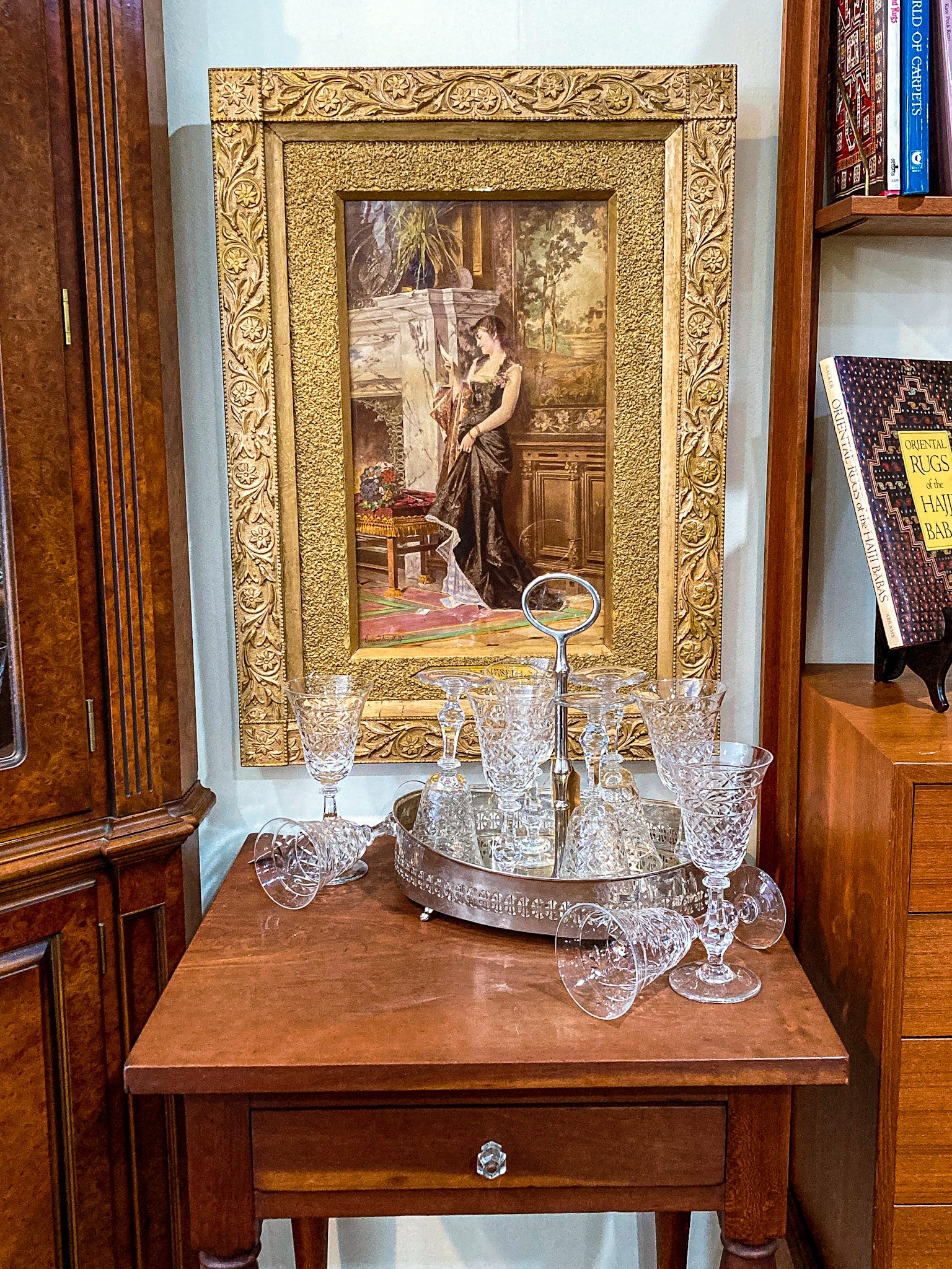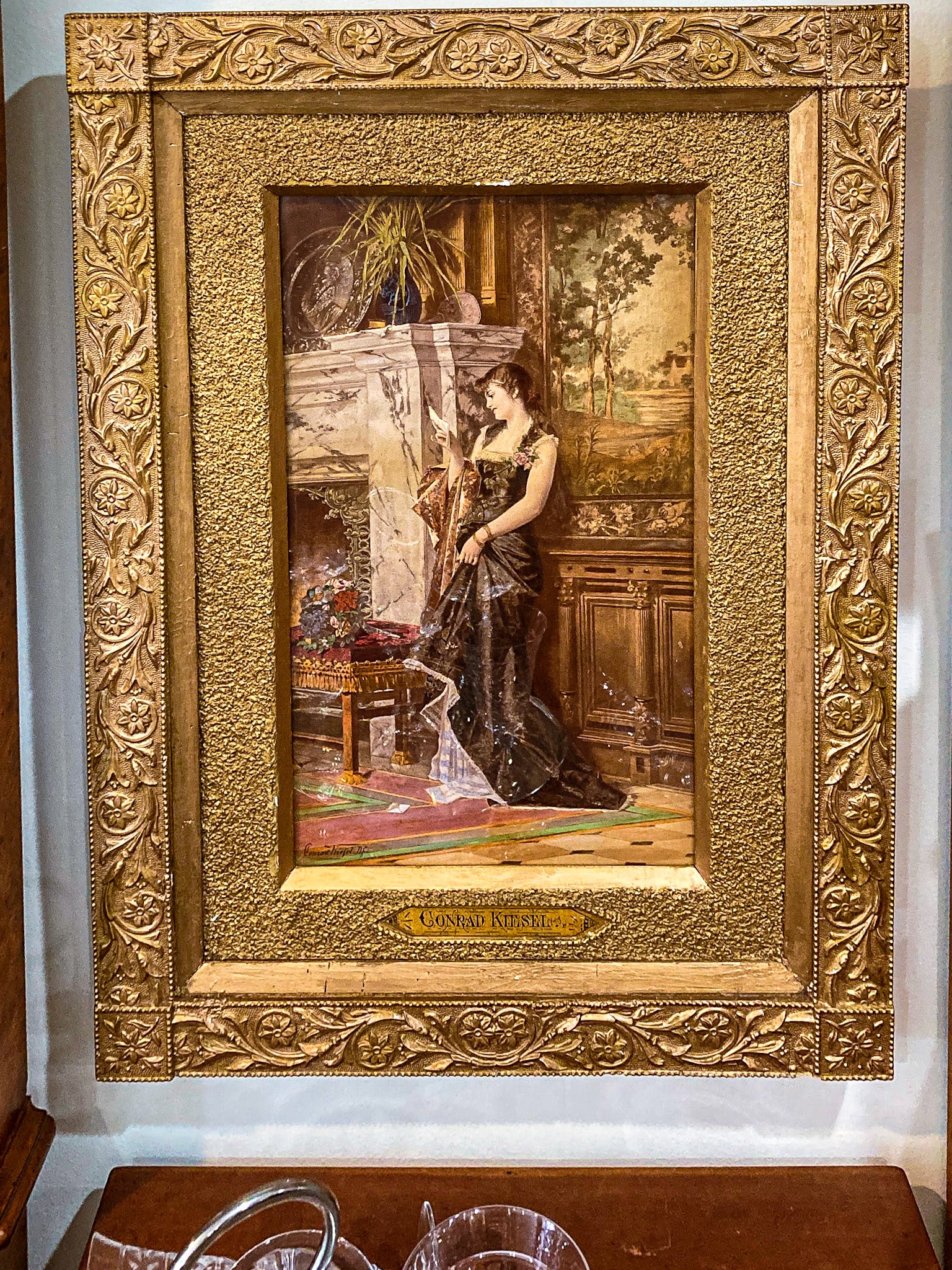 "Love Letter" an Antique Print by Conrad Kiesel (1846-1921) printed on board and hand colored. Conrad Kiesel was born in Prussia (now Germany) and spent most of his life studying and practicing artistic mediums. This beautifully framed piece features an elegantly dressed women leaning against a romantically painted wall next to a marble fireplace. In front of the fireplace sits a bouquet of flowers on a stool. The woman is entranced by the letter in her hand, clearly a welcomed token of affection.