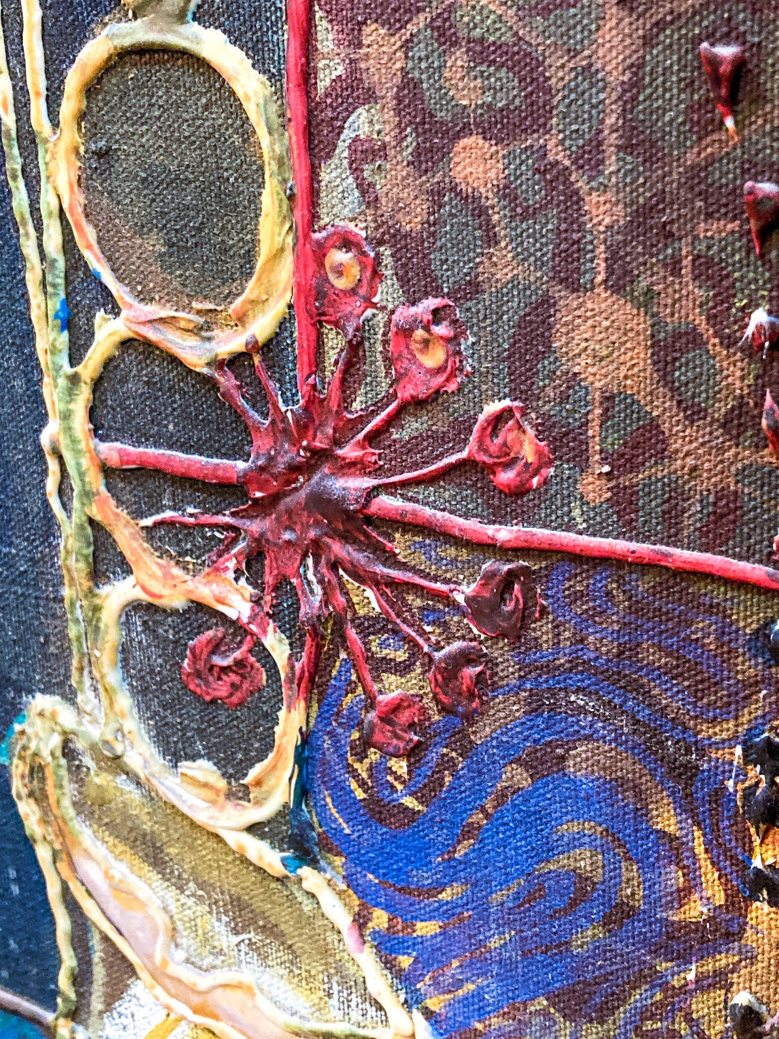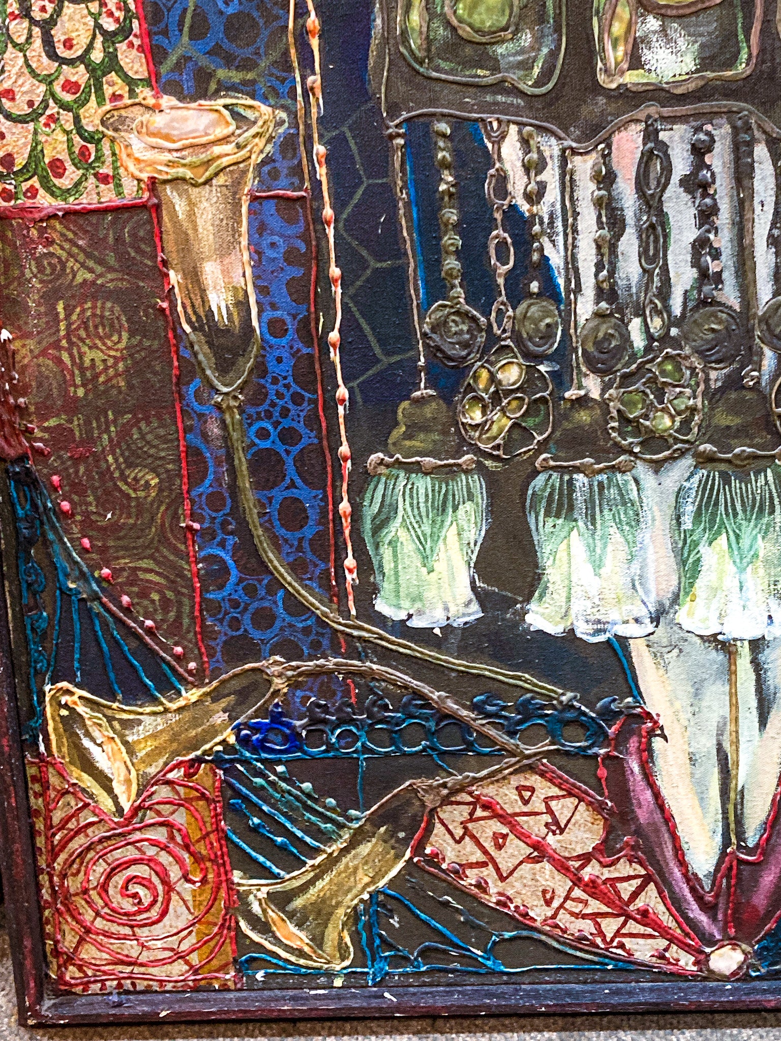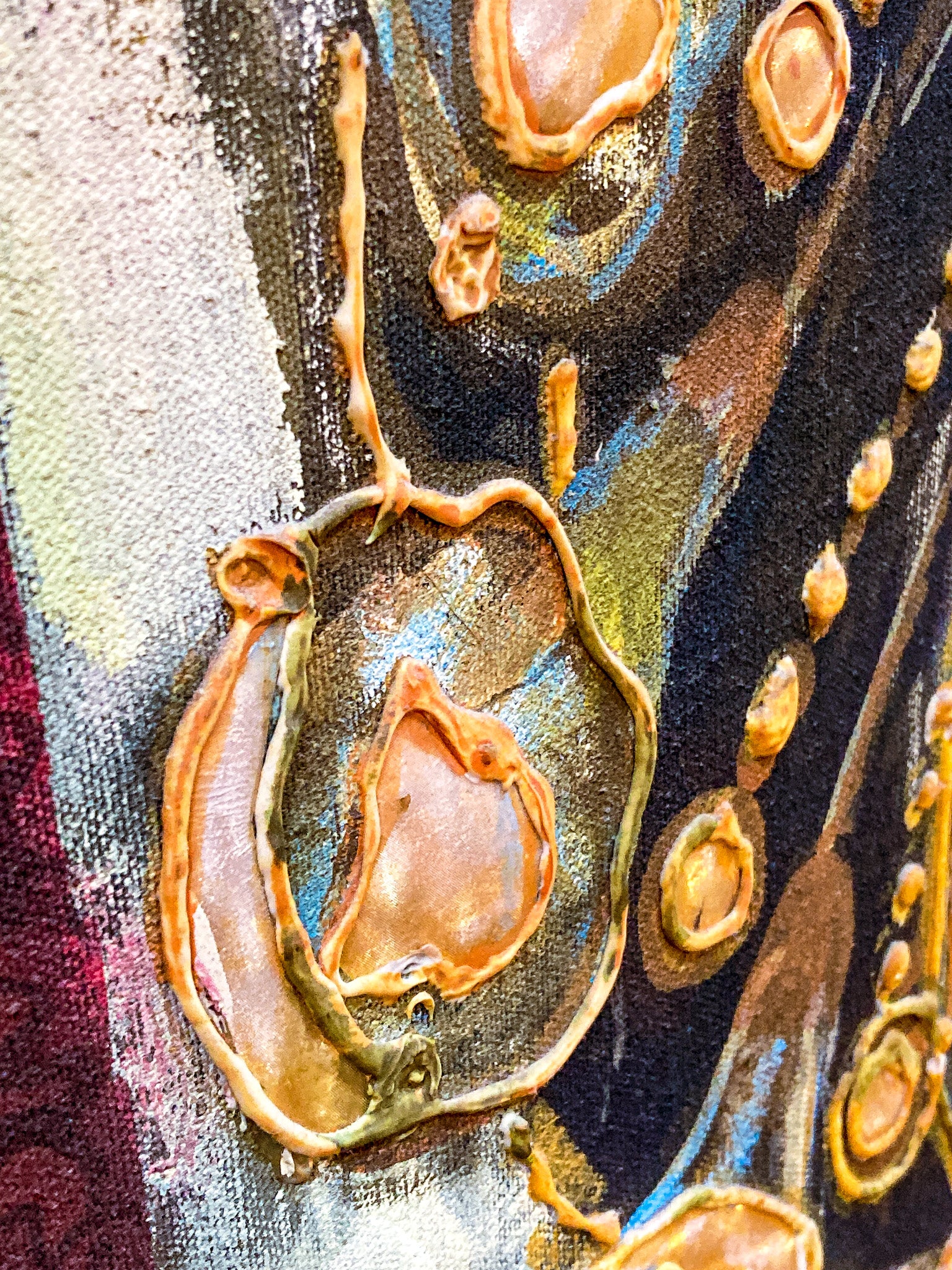 Vintage Mixed Media Portrait of Cleveland Bernice Kent Framed Canvas Painting; Unknown Artist; acrylics, fabrics, wax, and more are visible in this piece.